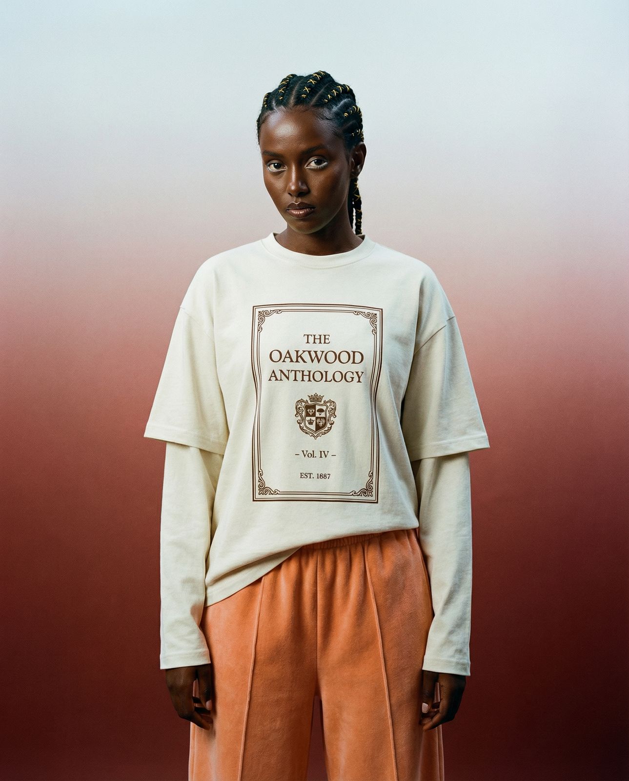 worn by worn by 23-year-old Lebanese-Ethiopian woman, obsidian skin, tight cornrows woven with gold thread, and eyes rimmed in white chalk @Fiction™ – Book-cover graphic tee @Fiction™ – Wide-leg sweatpants