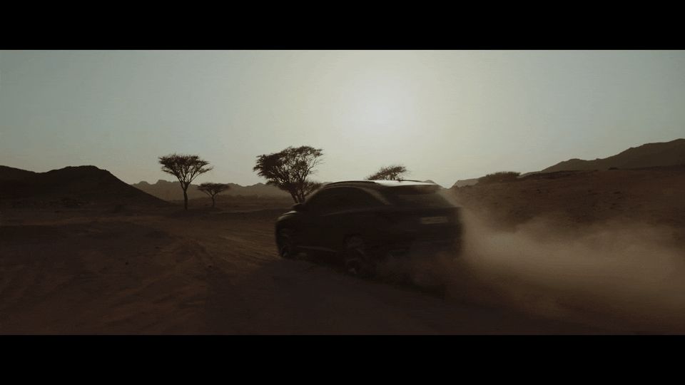 a car driving down a dirt road in the desert