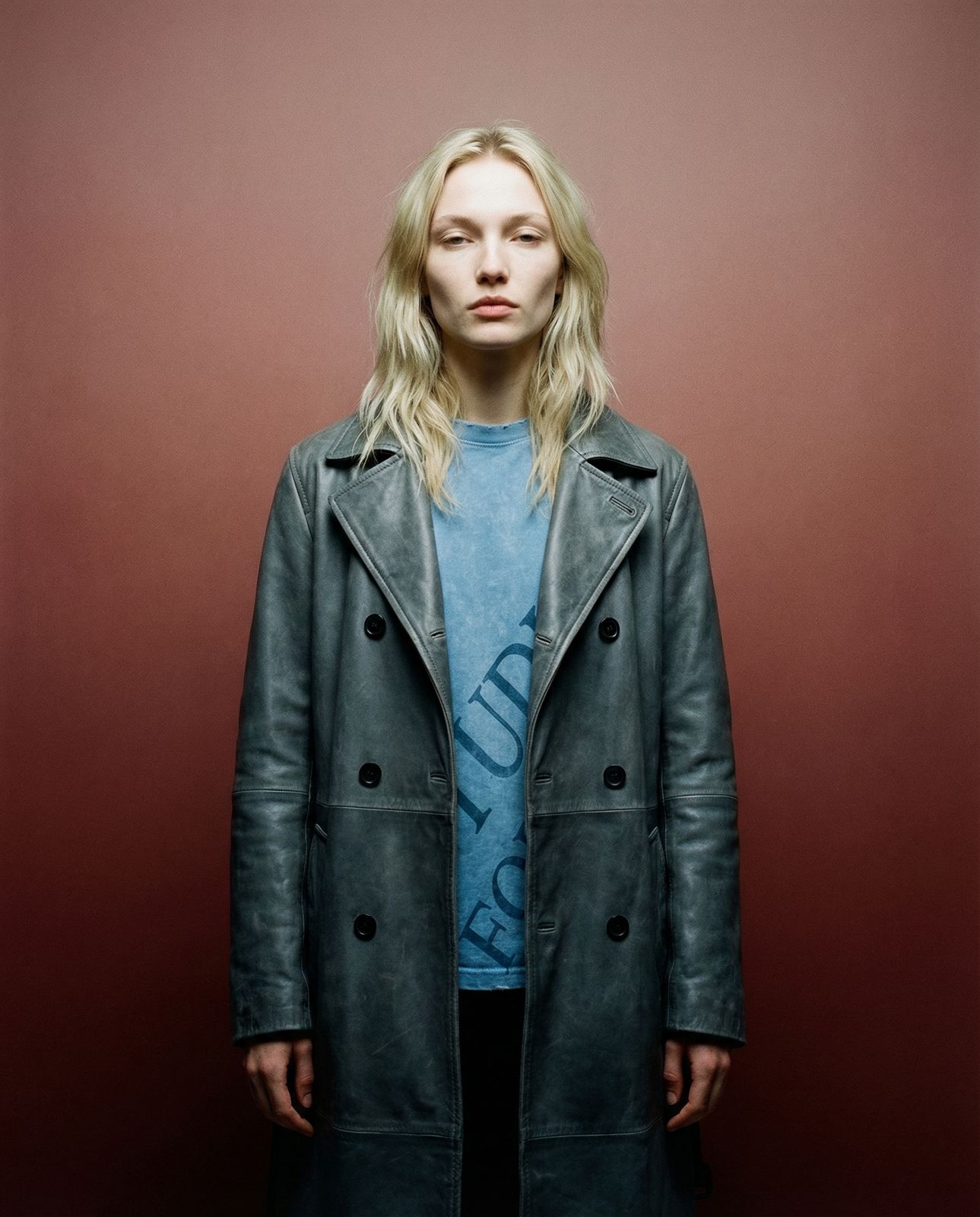 worn by 21 year old blonde woman with lazy eyes, natural, no make-up, high cheeks @Fiction™ – Oversized graphic long-sleeve tee @Fiction™ – Leather trench coat
