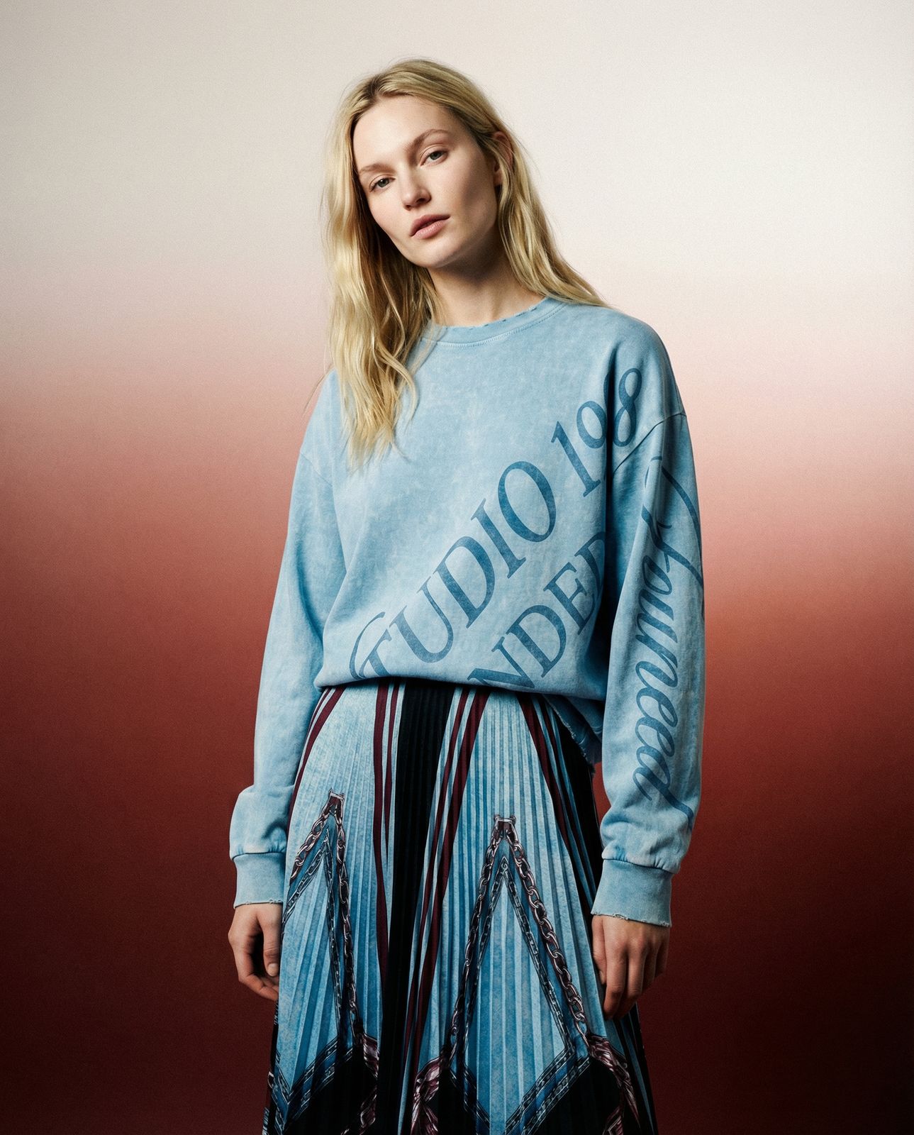 worn by 21 year old blonde woman with lazy eyes, natural, no make-up, high cheeks @Fiction™ – Oversized graphic long-sleeve tee @Fiction™ – Printed pleated skirt