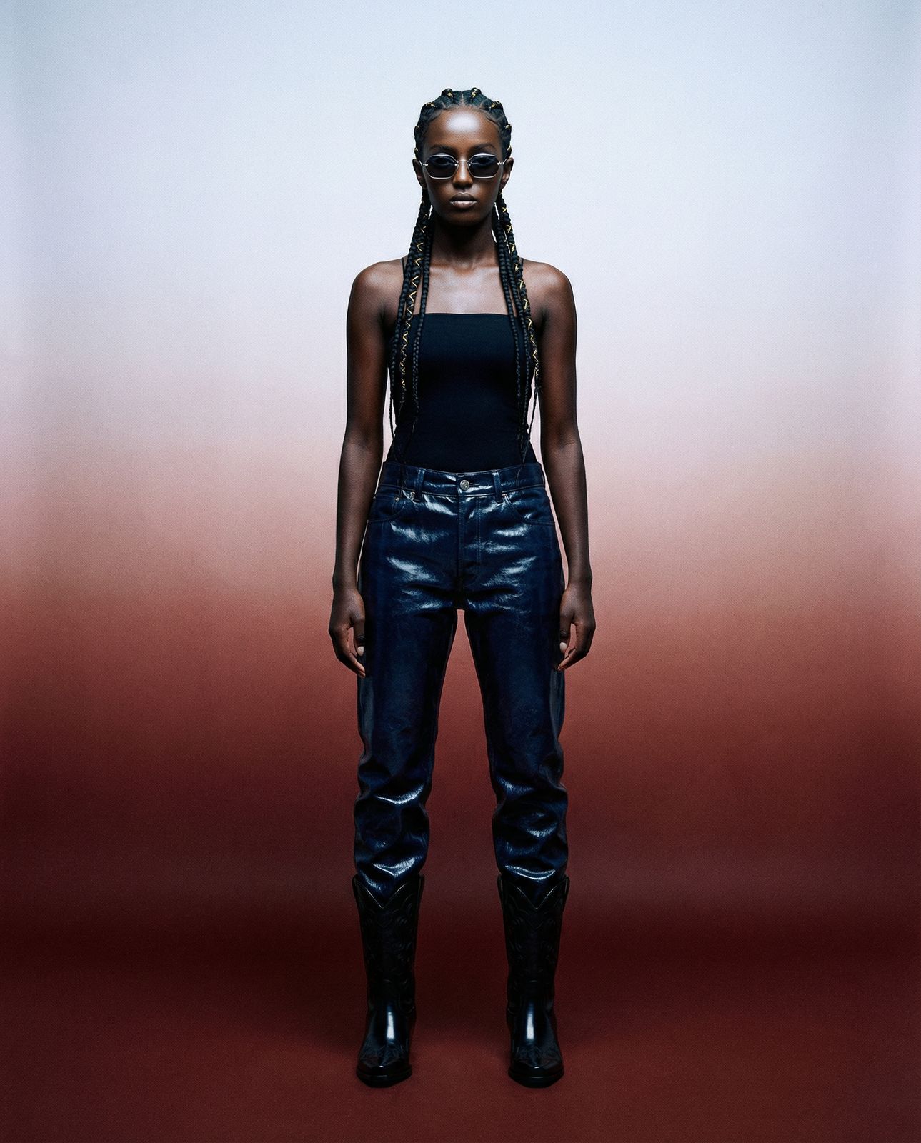 worn by worn by 23-year-old Lebanese-Ethiopian woman, obsidian skin, tight cornrows woven with gold thread, and eyes rimmed in white chalk @Fiction™ – Coated jeans @Fiction™ - Money Shades @Fiction™ – Western boot