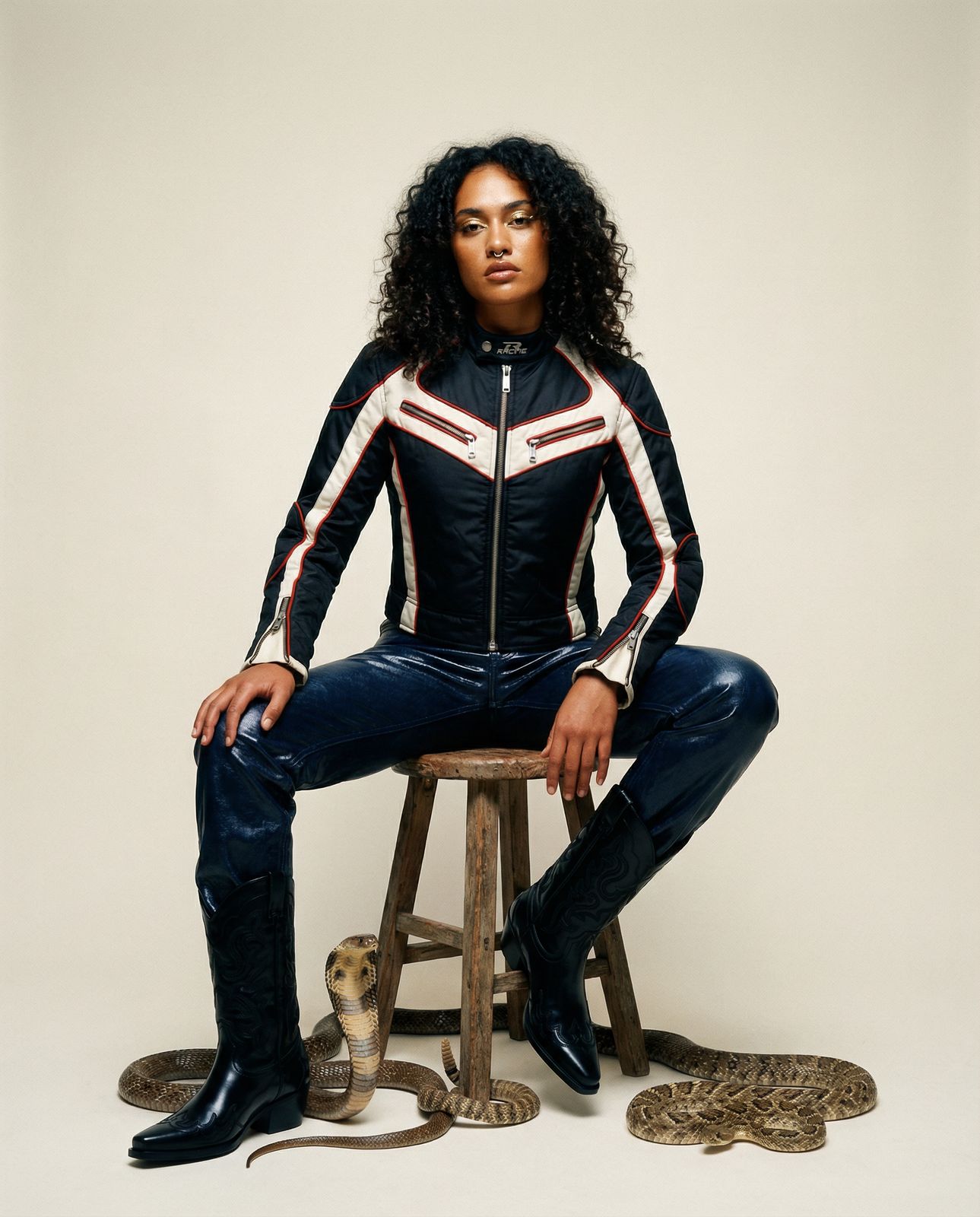 worn by 22-year-old Māori-Turkish woman, warm amber skin, textured hair, bold nose ring, and faint shimmer of gold on her eyelids @Fiction™ – Moto jacket @Fiction™ – Western boot @Fiction™ – Coated jeans
